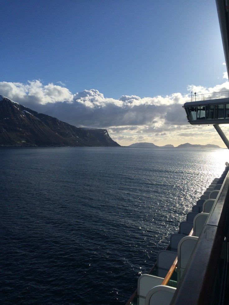 What the brochure failed to mention was “Be prepared for a fun packed sea adventure each evening when the ship will leave the safety of the Fjord and take battle with the rough North seas and blustery weather! It’ll be too cold to sit outside and too rough to watch a show so enjoy your cabins!”. Wonderful.